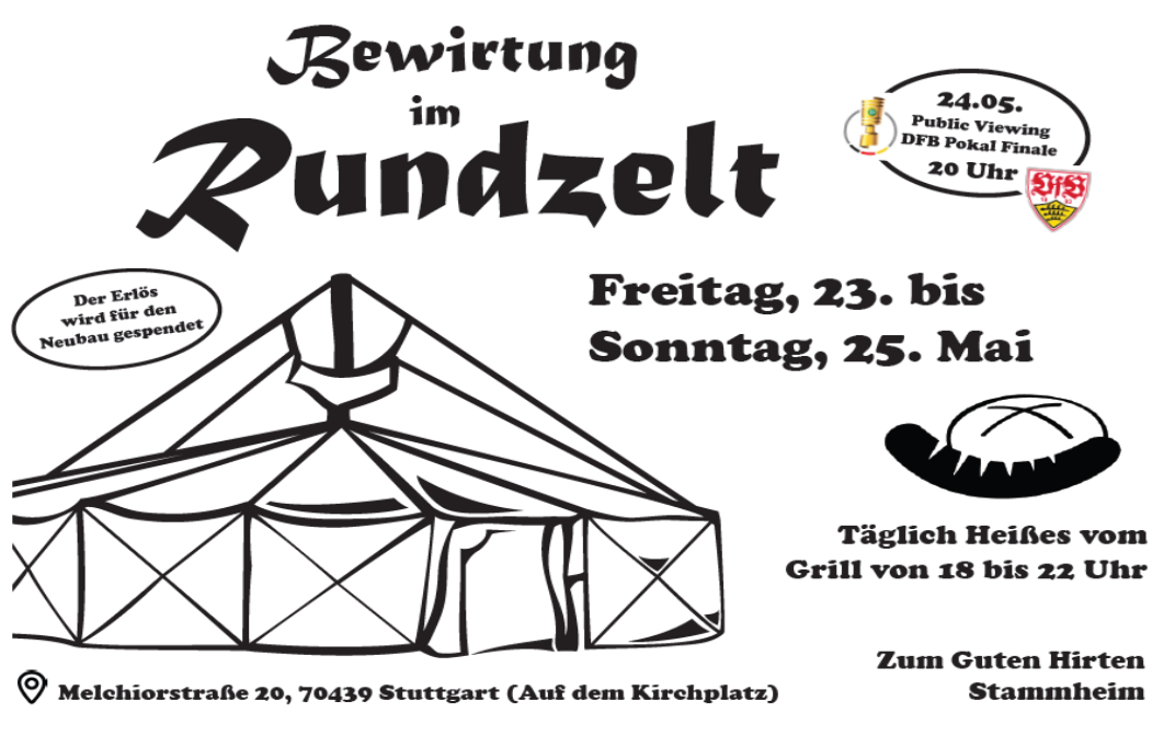 Von Freitag, den 23. Mai bis Sonntag, den 25. Mai 2025 übernimmt der Kirchengemeinderat und "Freunde" die Bewirtung im Rundzelt. Am Samstag Public Viewing des DFB Pokalfinales zwischen dem VfB Stuttgart und Arminia Bielefeld.