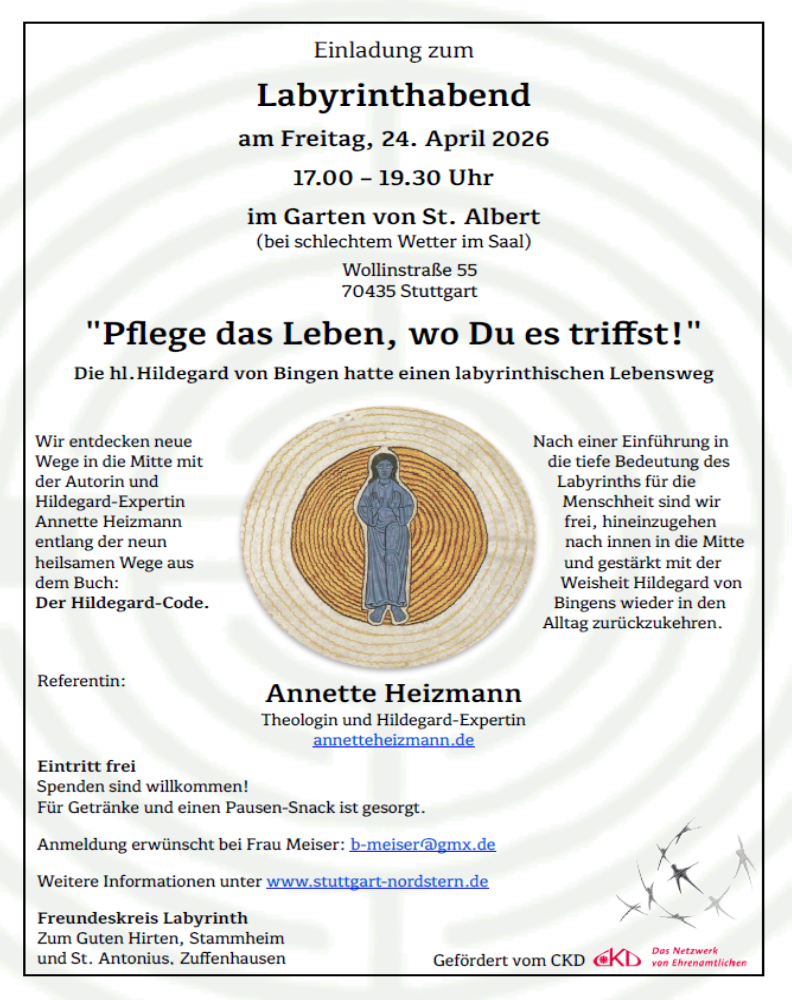 Herzliche Einladung zum Labyrinthabend am Freitag, 24. April 2026, von 17:00 bis 19:30 Uhr im Garten von St. Albert, Wollinstraße 55, 70439 Stuttgart (bei schlechtem Wetter im Saal).