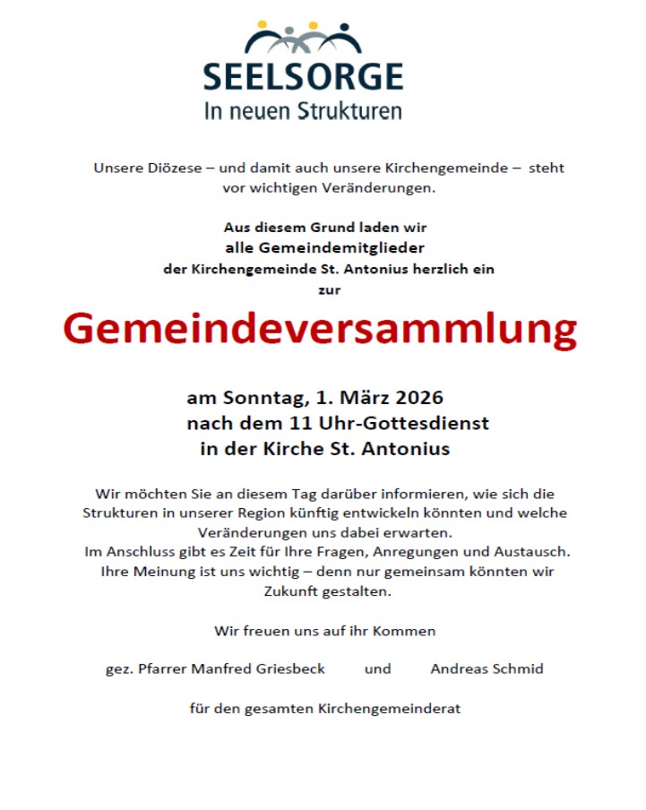 Herzliche Einladung zur Gemeindeversammlung am Sonntag, 01. März 2026, im Anschluss an den 11:00-Uhr-Gottesdienst in der Kirche „St. Antonius“. Informieren Sie sich, bringen Sie Ihre Fragen ein und gestalten Sie die Zukunft unserer Gemeinde aktiv mit.