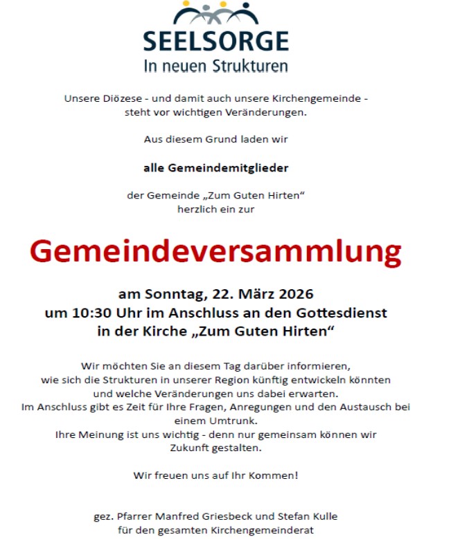Herzliche Einladung zur Gemeindeversammlung am Sonntag, 22. März 2026, um 10:30 Uhr im Anschluss an den Gottesdienst in der Kirche „Zum Guten Hirten“. Informieren Sie sich, bringen Sie Ihre Fragen ein und gestalten Sie die Zukunft unserer Gemeinde aktiv mit.
