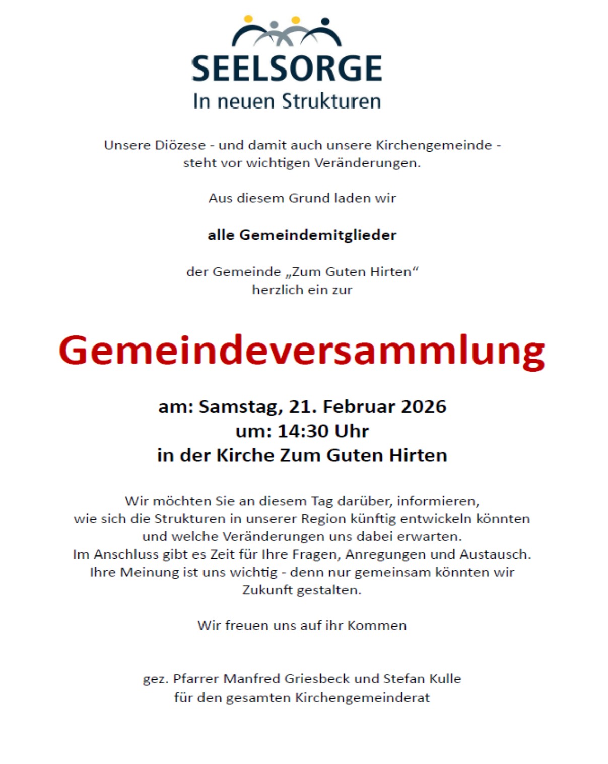 Aus diesem Grund laden wir alle Gemeindemitglieder herzlich zur Gemeindeversammlung am Samstag, 21. Februar 2026, um 14:30 Uhr in der Kirche „Zum Guten Hirten“ (Flyer Einladung) ein.