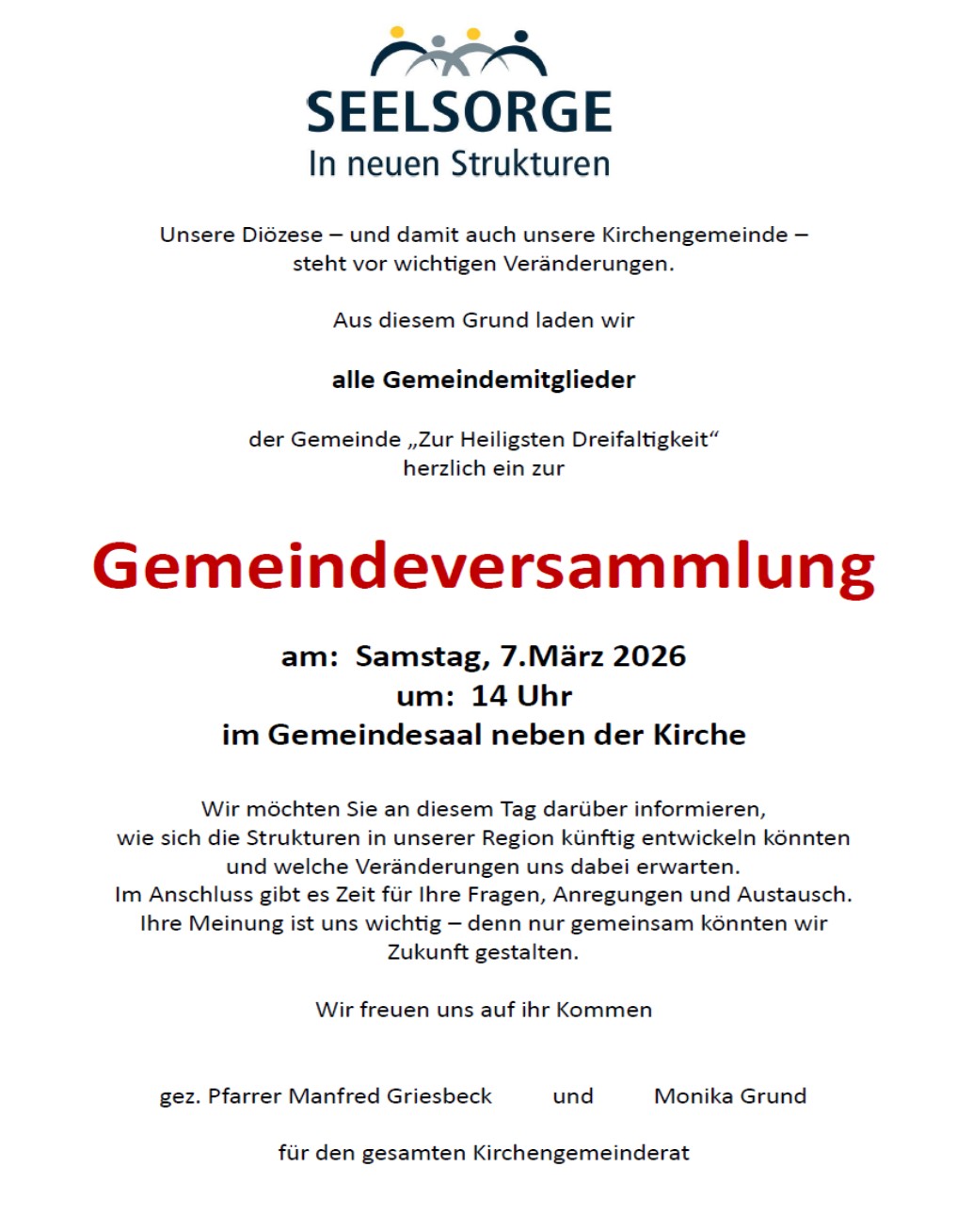 Aus diesem Anlass laden wir alle Gemeindemitglieder der Gemeinde „Zur Heiligsten Dreifaltigkeit“ herzlich zur Gemeindeversammlung (Einladung) ein.